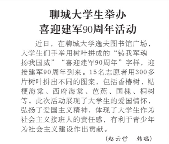 近日,在聊城大學逸夫圖書館廣場,大學生們手舉用樹葉拼成“鑄我軍魂 揚我國威”“喜迎建軍90周年”字樣,迎接建軍90周年到來。15名志愿者用300多片樹葉拼出不同的圖案,包括香椿樹、貼梗海棠、西府海棠、芭蕉、國槐、桐樹等。此次活動展現了大學生的愛國情懷,弘揚了愛國主義精神,體現了大學生作為社會主義接班人的責任感,有利于青少年為社會主義建設作出貢獻。
